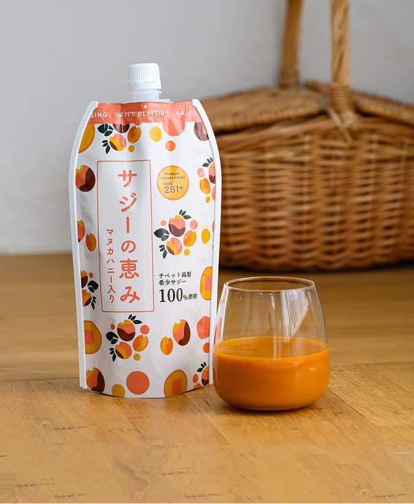 標高3,000m、チベットの厳しい大地で育った最高級クイーンサジーに、マヌカハニーの上品な甘さをひとさじ。マヌカハニーは現地から直輸入し、国内の工場で丁寧に加工。